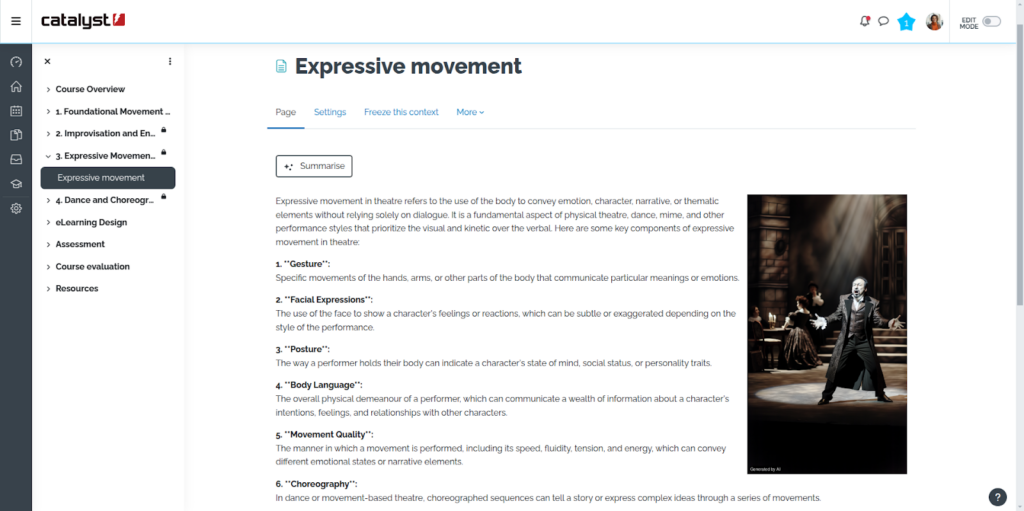 Vous pouvez également utiliser des images gratuites, comme celles d’Unsplash, ou des images de stock internes. Si vous l’avez activée, la dernière version de Moodle vous permet d’utiliser l’IA pour créer des images, comme dans l’exemple de la capture d’écran ci-dessous :