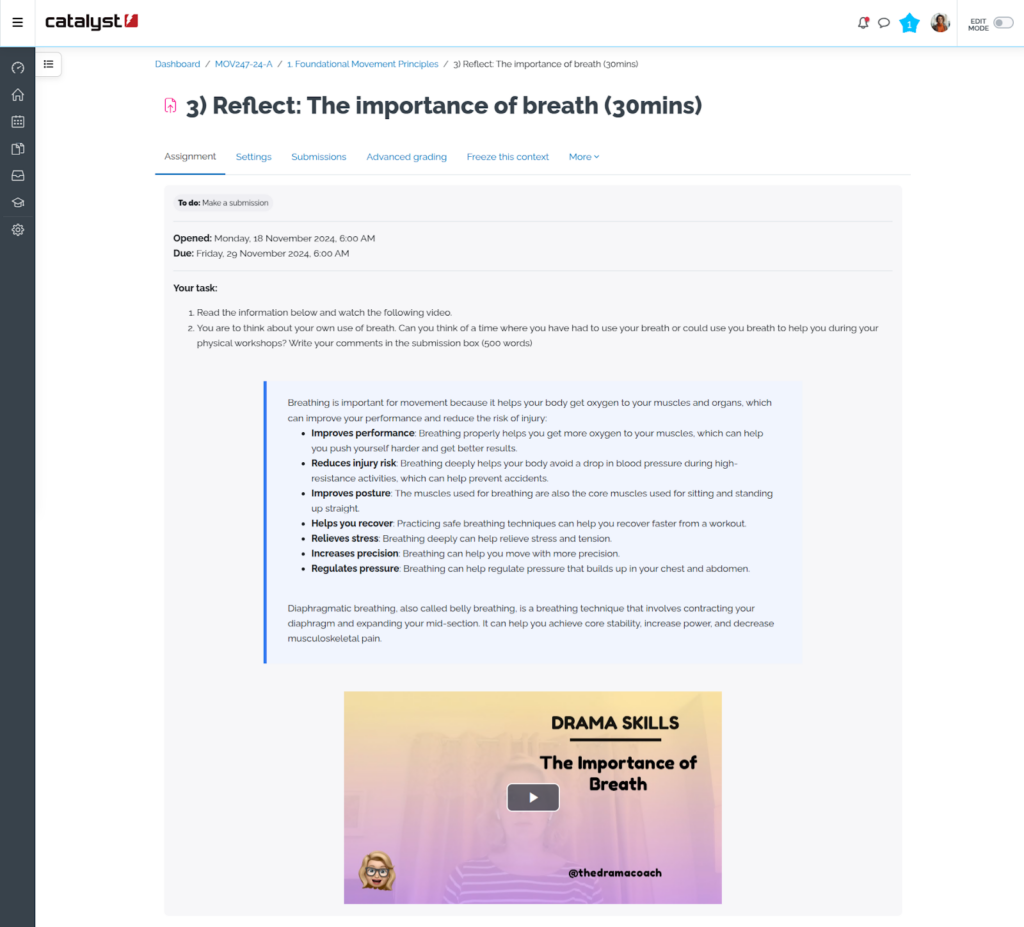 Vous pouvez envisager de concevoir des activités dans lesquelles les apprenants sont invités à regarder une vidéo, à réfléchir à des questions guidées et à soumettre leurs réponses. Vous pouvez faire de même avec les activités de forum et toute autre tâche où l’apprenant doit se voir présenter de nouvelles informations afin d’en comprendre le sens.