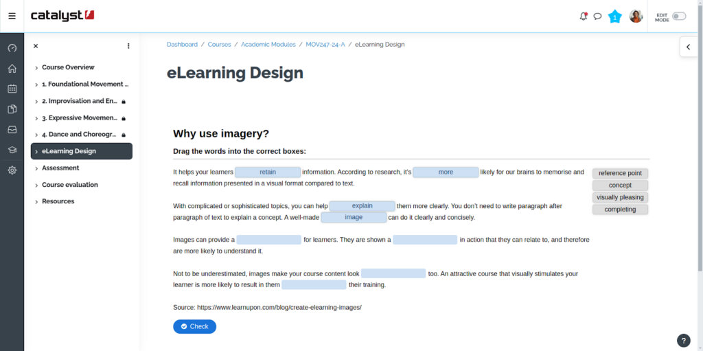 Utilisez l’outil Moodle H5P pour créer un contenu qui va au-delà du texte, comme une simple activité de glisser-déposer. Cela prend moins de 5 minutes à créer et donne aux apprenants quelque chose d’actif à faire.